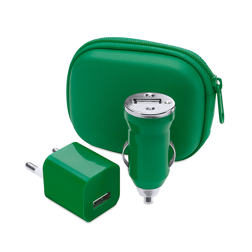 USB-Ladegeräte für Auto und Wand. 1.000 mA Ladekapazität und in ansprechenden Farben. Mit Ladestandsanzeige und in einem robusten Lederetui in passender Farbe. Grün - foto