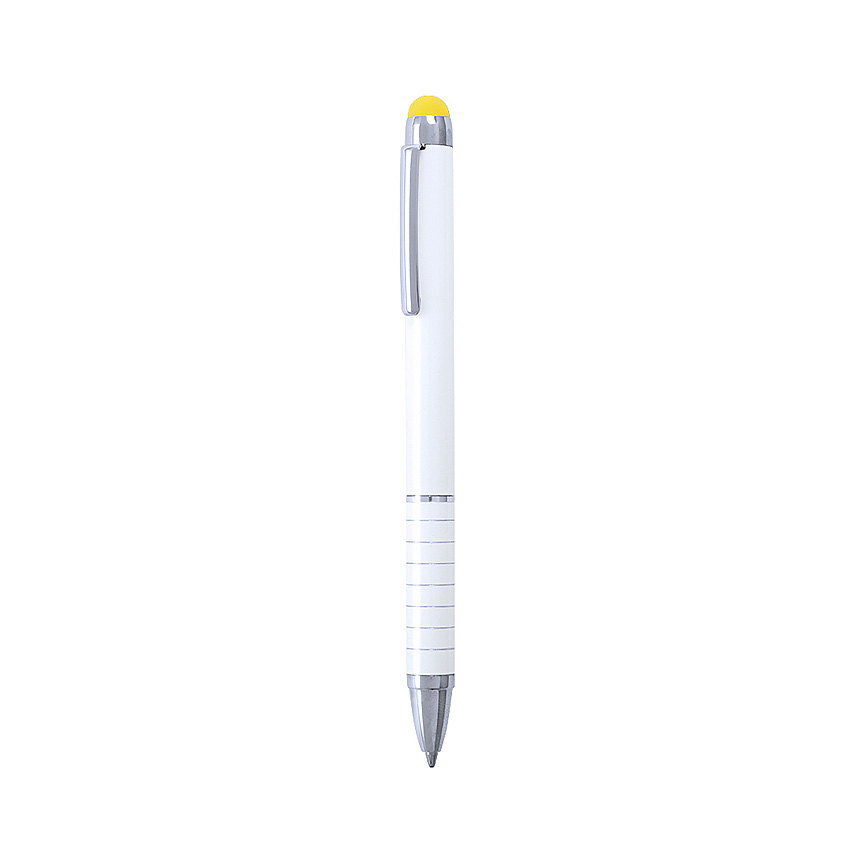 Kugelschreiber mit Drehmechanismus und Aluminiumgehäuse in elegantem Weiß mit glatter Metallic-Oberfläche. Accessoires und Ringe in Silber. Gelb - foto