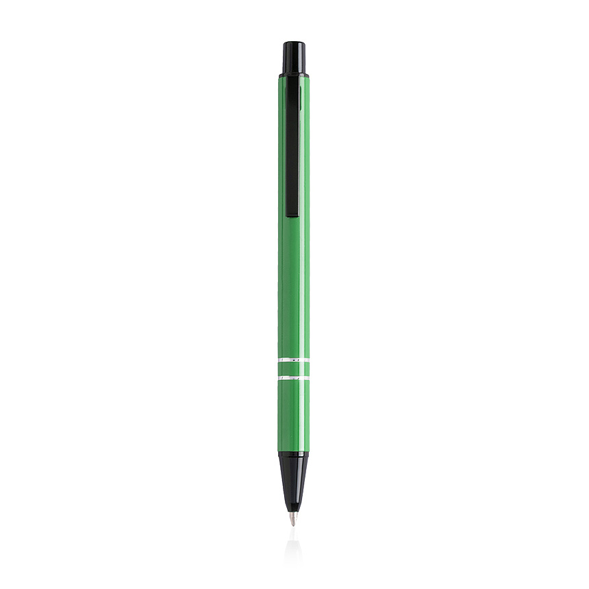 Druckkugelschreiber im originellen zweifarbigen Design. Mit glattem Aluminiumgehäuse in leuchtenden Farben. Accessoires in Schwarz und Ringe in Silber. Grün - foto