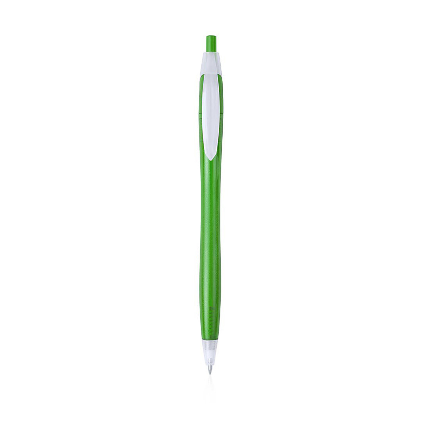 Druckkugelschreiber mit auffälligem zweifarbigen Design und geschwungenem Schaft, in fröhlichen, durchscheinenden Farben und mit flachem Clip. Blauschreibend. Grün - foto
