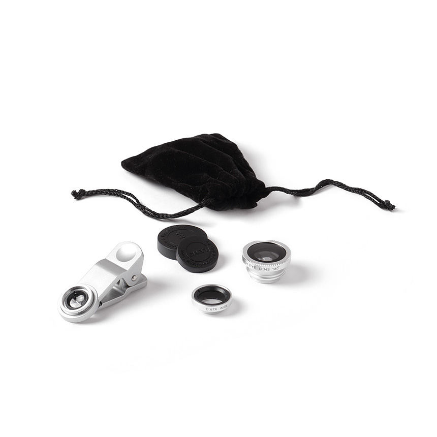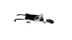 Set mit 3 Universalobjektiven für Smartphones, die mit einem Clip an der Kamera befestigt werden können.