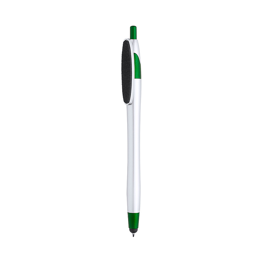 Druckkugelschreiber im auffälligen zweifarbigen Design mit farbenfrohen Details und einem geschwungenen Gehäuse in glattem Silbermetallic. Grün - foto