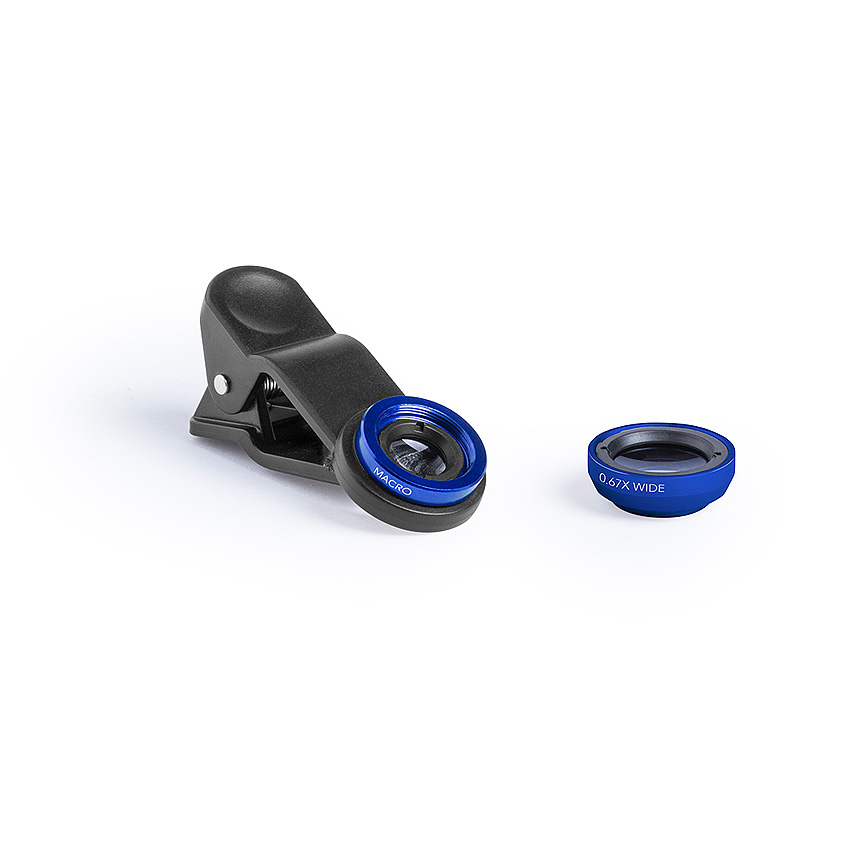 Universal-Objektivset für Smartphones, mit einer Pinzette an die Kamera anpassbar. Aluminium- und Glaslinsen mit Makro- und Weitwinkeleffekten. blau - foto
