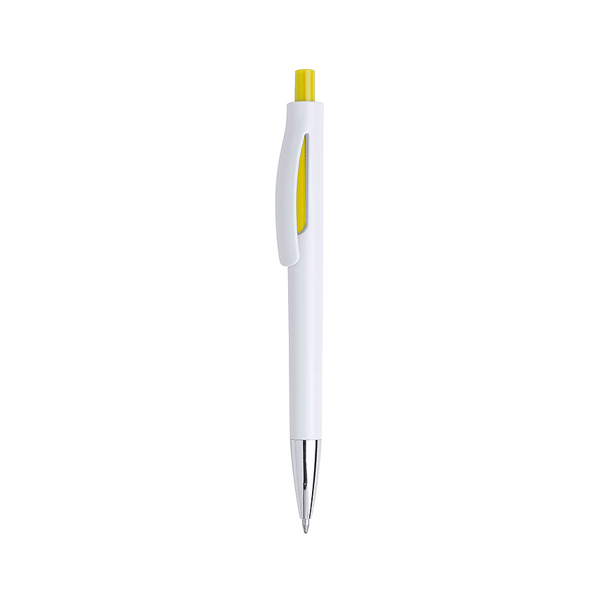 Druckkugelschreiber mit markantem zweifarbigem Design und Details in leuchtenden Farben. Glattes Gehäuse in reinem Weiß. Gelb - foto