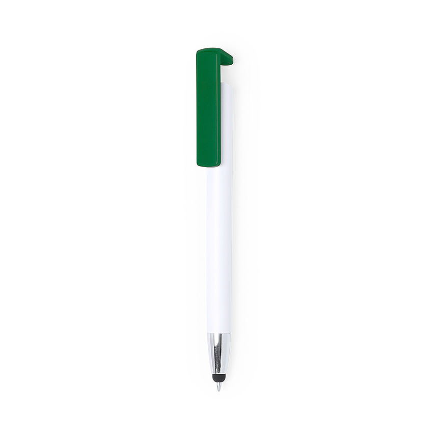 Origineller Kugelschreiber mit Druckmechanismus und integriertem Cliphalter für Mobilgeräte. Im auffälligen zweifarbigen Design und mit weichem Schaft in… Grün - foto
