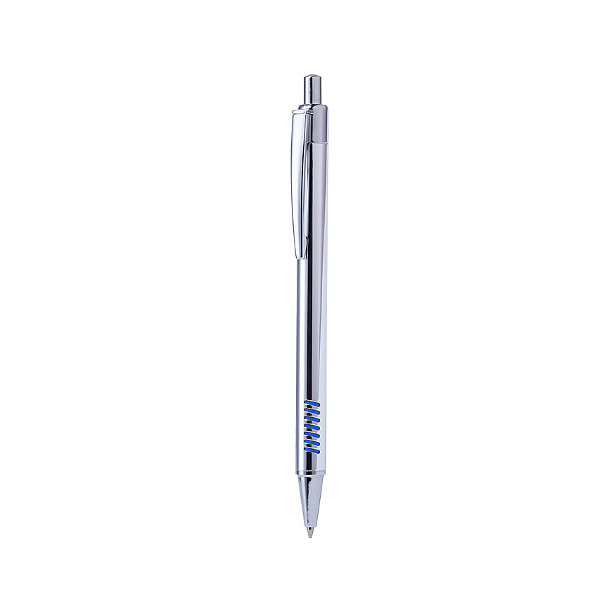 Verchromter Kugelschreiber mit Aluminiumgehäuse und auffälligem Griffstück in vielen leuchtenden Farben. Druckmechanismus, Jumbo-Mine und blauschreibende Tinte.